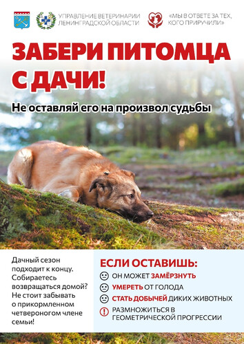 Ежегодно окончание дачного сезона становится маленькой трагедией для сотен прикормленных собак и кошек. Специалисты Управления ветеринарии Ленинградской области стремятся сократить количество брошенных на зимовку питомцев, поэтому каждую осень проводят информационную кампанию «Забери питомца с дачи». Работа проводится в рамках проекта «Мы в ответе за тех, кого приручили», направленного на формирование ответственного отношения к животным. Для привлечения внимания к проблеме брошенных животных проводится большая информационная работа. К завершению дачного сезона активно распространяется социальная реклама – устанавливаются билборды, призывающие не оставлять питомцев, распространяются листовки и публикации в соцсетях. Как сообщают специалисты Управления ветеринарии ЛО, для большинства домашних животных зимовка в одиночку без человека означает гибель. Собаки и кошки гибнут от холода и голода, а выйдя за пределы садоводств в поисках пищи, они могут стать легкой добычей для лесных хищников. Но даже если животное каким-то чудом выживает, появляется высокий риск бесконтрольного размножения в геометрической прогрессии. Одна пара безнадзорных собак производит в год в среднем десять щенков, которые уже через год способны сами приносить потомство. | |